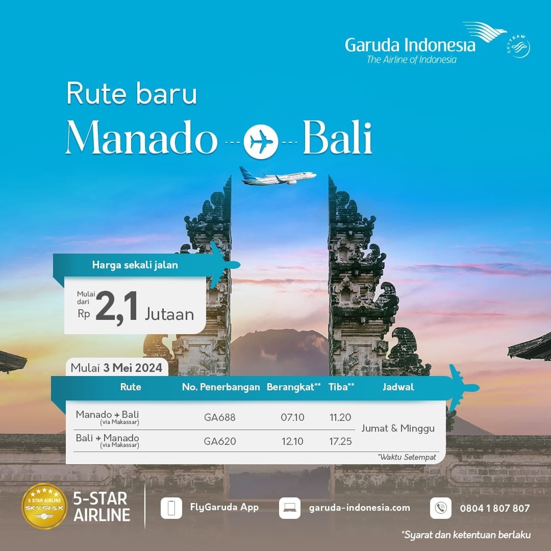 Rute penerbangan Manado – Denpasar pp via Makassar tersebut akan dioperasikan sebanyak 2 (dua) kali setiap minggunya, dengan menggunakan armada Boeing 737-800 NG yang memiliki konfigurasi 12 penumpang kelas bisnis dan 150 penumpang kelas ekonomi. Penerbangan rute Manado – Denpasar via Makassar tersebut akan dilayani dengan nomor penerbangan GA688 yang dijadwalkan berangkat dari Bandara Internasional Sam Ratulangi pukul 07.10 WITA dan tiba di Bandara Internasional I Gusti Ngurah Rai pukul 11.20 WITA. Sementara itu, penerbangan Denpasar – Manado via Makassar akan dioperasikan dengan nomor penerbangan GA620 yang dijadwalkan berangkat dari Bandara Internasional I Gusti Ngurah Rai pukul 12.10 WITA dan tiba di Bandara Internasional Sam Ratulangi pukul 17.25 WITA.