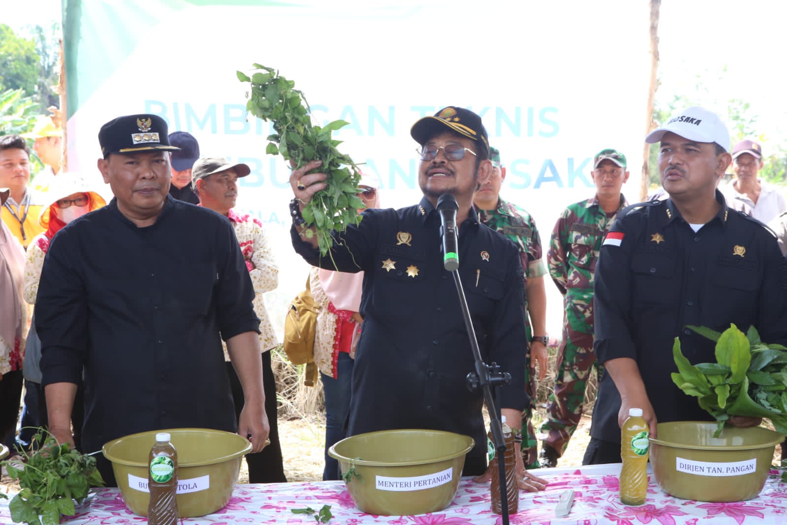 Kalsel, (DelikAsia.com) | Menteri Pertanian Syahrul Yasin Limpo (Mentan SYL) memimpin langsung pembuatan Elisitor Biosaka bersama petani, penyuluh, Penjabat Bupati Barito Kuala (Batola), Kepala Dinas Pertanian Provinsi di Kalimantan Selatan, aparat TNI dan Polri. Demonstrasi pembuatan Biosaka yang disambut meriah petani ini bertujuan menggelorakan pertanian berkelanjutan sehingga petani tidak bergantung lagi pada pupuk kimia, apalagi menghadapi ancaman perubahan iklim ekstrim yang menyebabkan kemarau panjang (El Nino).