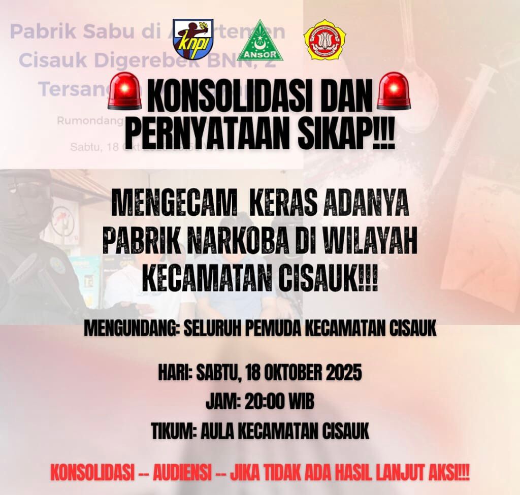 Delik Asia, (Kabupaten Tangerang) | Terungkapnya pabrik narkotika jenis sabu berskala besar di salah satu unit apartemen di kawasan Cisauk, Kabupaten Tangerang, oleh Badan Narkotika Nasional (BNN) pada Jumat (18/10/2025), memicu gelombang keprihatinan dari elemen pemuda setempat. Melalui sebuah pernyataan sikap yang dirilis pada Sabtu (18/10/2025), Pemuda Cisauk menyampaikan tuntutan kritis terhadap berbagai pihak yang dianggap lalai menjaga keamanan wilayah.