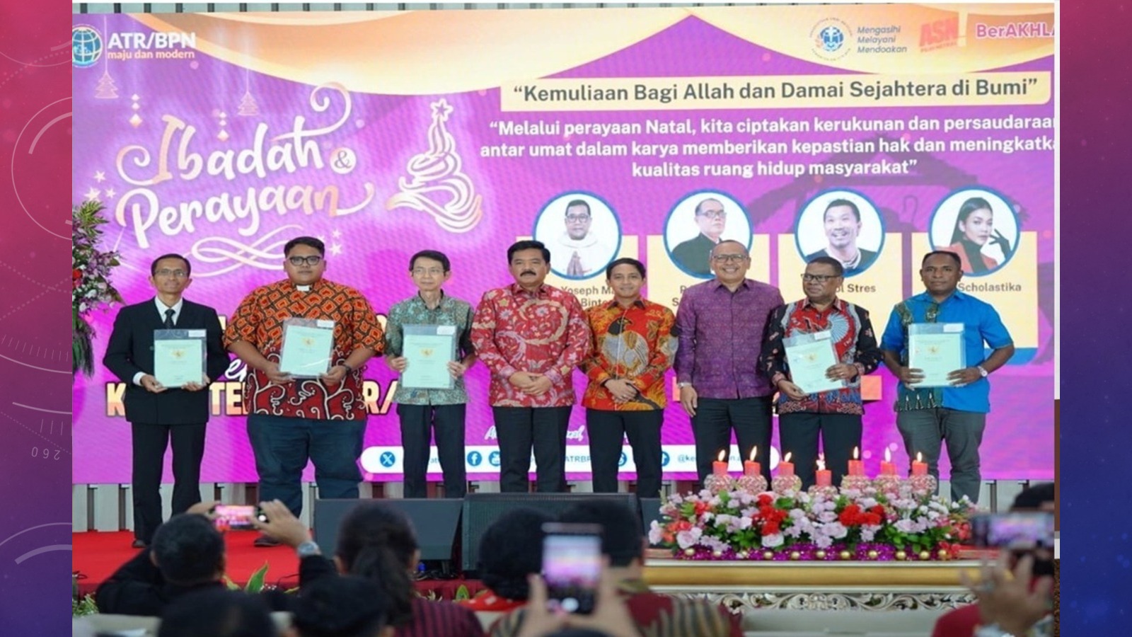 Dalam kesempatan ini, Menteri ATR/Kepala BPN didampingi Wakil Menteri ATR/Wakil Kepala BPN, Raja Juli Antoni bersama Sekretaris Jenderal, Suyus Windayana menyerahkan 7 (tujuh) Sertipikat Hak Milik yang diperuntukkan bagi rumah ibadah yang berada di sejumlah wilayah. Antara lain, Provinsi DKI Jakarta, Provinsi Jawa Barat dan Porvinsi Papua.