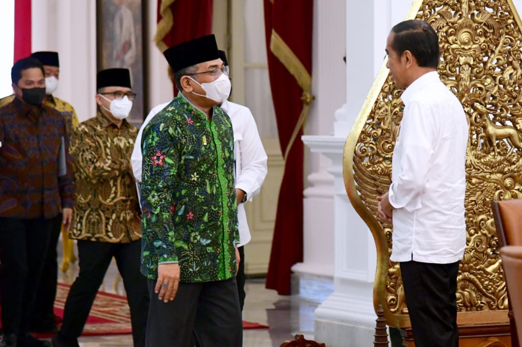 Turut mendampingi Presiden dalam pertemuan tersebut yaitu Menteri Sekretaris Negara Pratikno dan Menteri Agama Yaqut Cholil Qoumas. (BPMI SETPRES/UN).