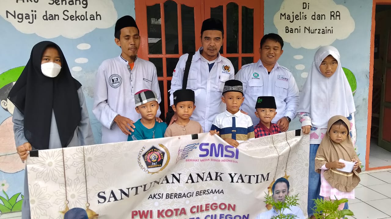 Cilegon, (DelikAsia.com) | Persatu Wartawan Indonesia (PWI) bersama Serikat Media Siber Indonesia (SMSI) Kota Cilegon memberikan santunan pada sejumlah yatim piatu di Majlis Ta’lim Bani Nuruzaini, lingkungan Terate Udik, RT/RW 01/02, Kelurahan Masigit, Kecamatan Jombang, Kamis (20/4/2023).