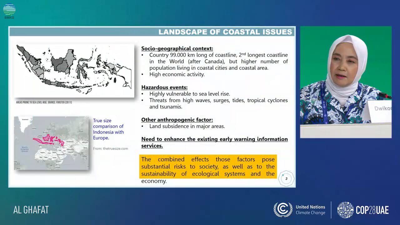 DelikAsia.com, (Dubai) | Kepala Badan Meteorologi, Klimatologi, dan Geofisika (BMKG) Dwikorita Karnawati menekankan pentingnya pengamatan dan pelayanan wilayah pesisir dan laut secara terpadu guna mendukung ketahanan terhadap perubahan iklim dan bahaya laut lainnya.