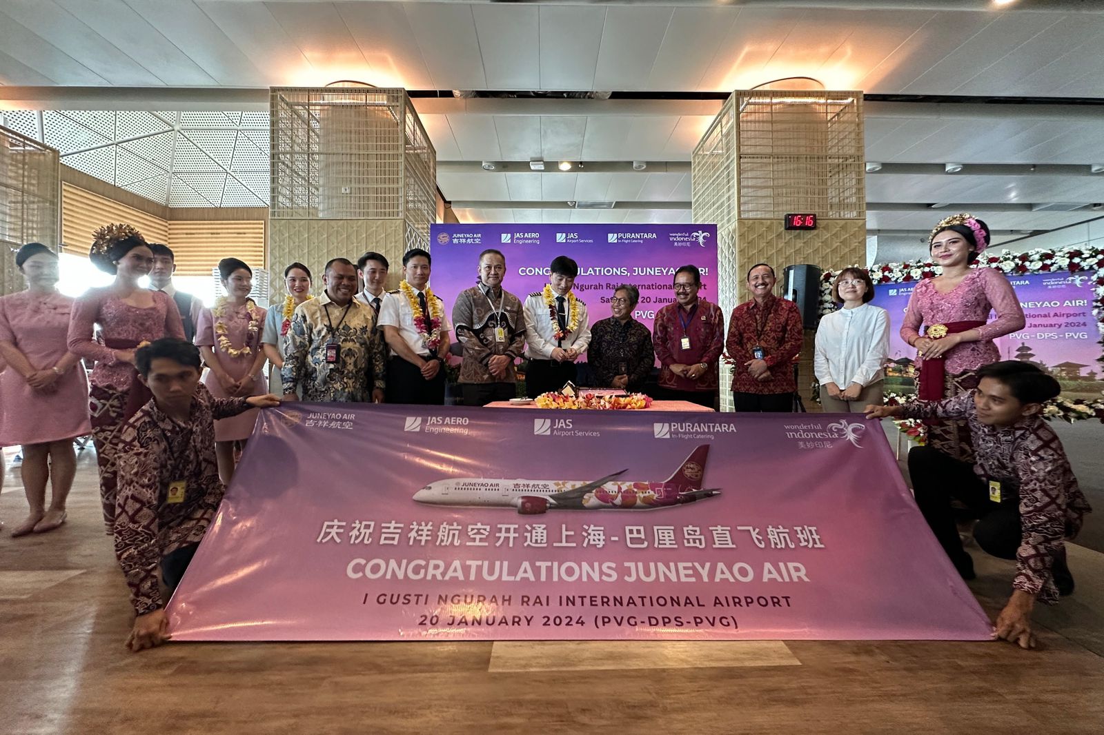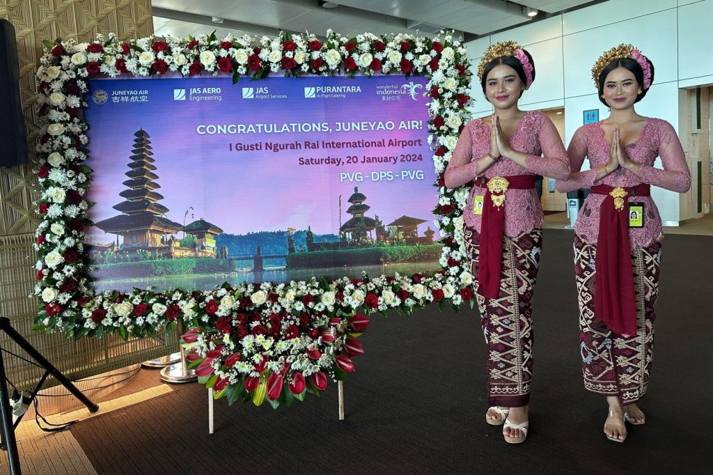 Penerbangan perdana Juneyao Airlines rute PVG-DPS dimulai pada 20 Januari 2024. Pesawat Airbus A320-neo bernomor HO1355 dengan kapasitas 164 penumpang itu berangkat dari Shanghai (PVG) pukul 08:35 CST (waktu Tiongkok) dan tiba di Denpasar (DPS) pukul 15.10 WITA. Selanjutnya, rute PVG-DPS akan terbang setiap hari dengan frekuensi 1 (satu) kali penerbangan.