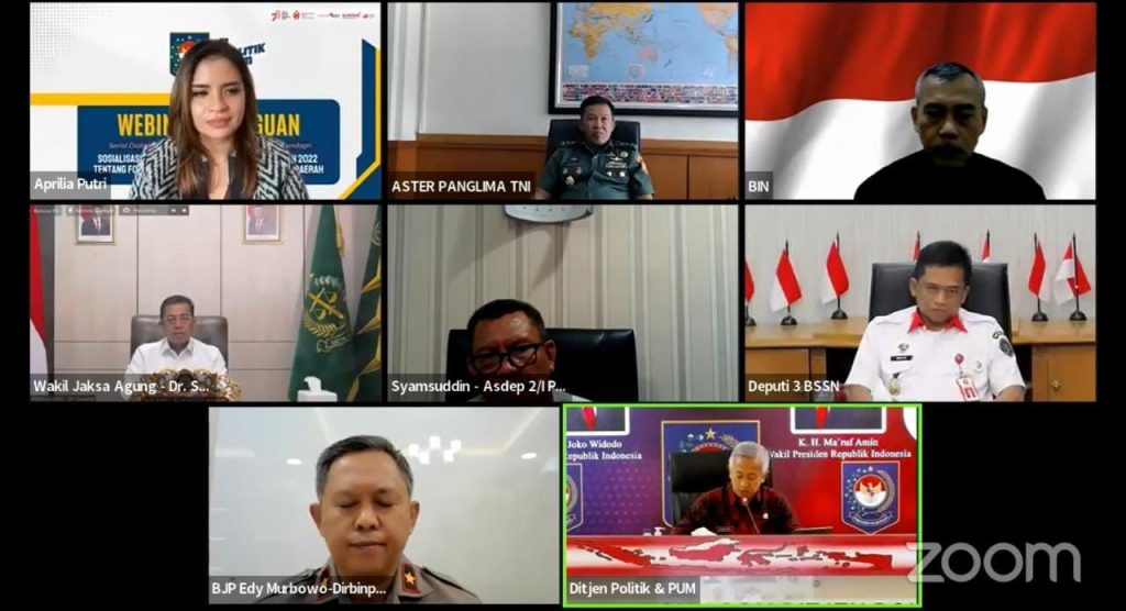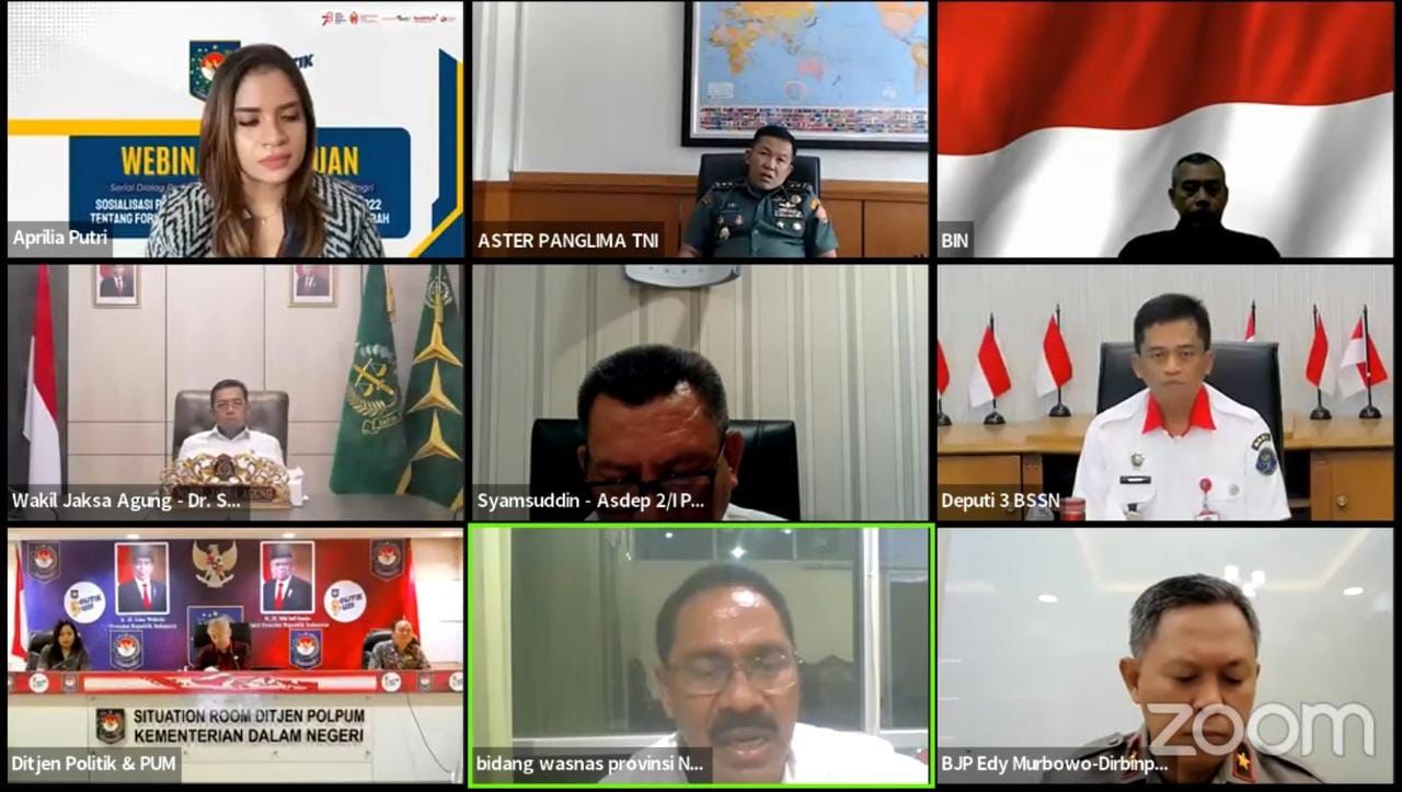 Hadir dalam kegiatan tersebut secara virtual yaitu perwakilan Tentara Nasional Indonesia (TNI), perwakilan Badan Siber dan Sandi Negara (BSSN), perwakilan Kemenkopolhukam, perwakilan Badan Intelijen Negara (BIN) dan perwakilan Kepolisian RI dengan peserta kegiatan adalah anggota Forum Koordinasi Pimpinan di Daaerah (Forkopimda) seluruh Indonesia.[RED/K.3.3.1].