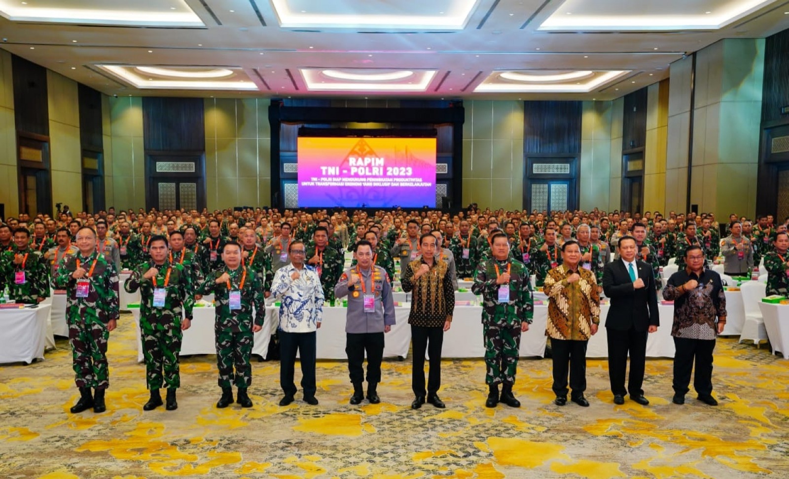 Sumber dan Foto: Puspen TNI. Jakarta, (DelikAsia.com) | Tentara Nasional Indonesia (TNI) dan Kepolisian Republik Indonesia (Polri) menggelar Rapat Pimpinan (Rapim) TNI-Polri tahun 2023 mengusung tema, “TNI-Polri Siap Mendukung Peningkatan Produktivitas Untuk Transformasi Ekonomi Yang Inklusif dan Berkelanjutan”. Bertempat di Golden Ballroom The Sultan Hotel dan Residence, Jalan Gatot Subroto, Tanah Abang Jakarta Selatan, Rabu (8/2/2023).